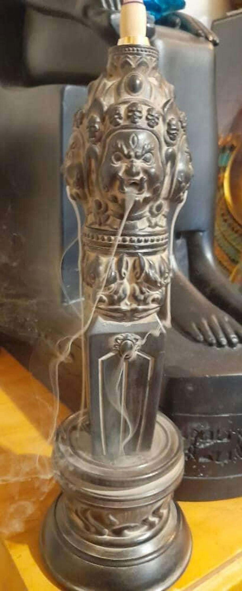 When you light the Incense cone above, and witness the heavy, spiralling, plumes of incense smoke, cascade out of MahaKalas Mouths, like tantalising Tongues, then you will truly understand and appreciate , this stunning and amazing Incense Offering Vessel.